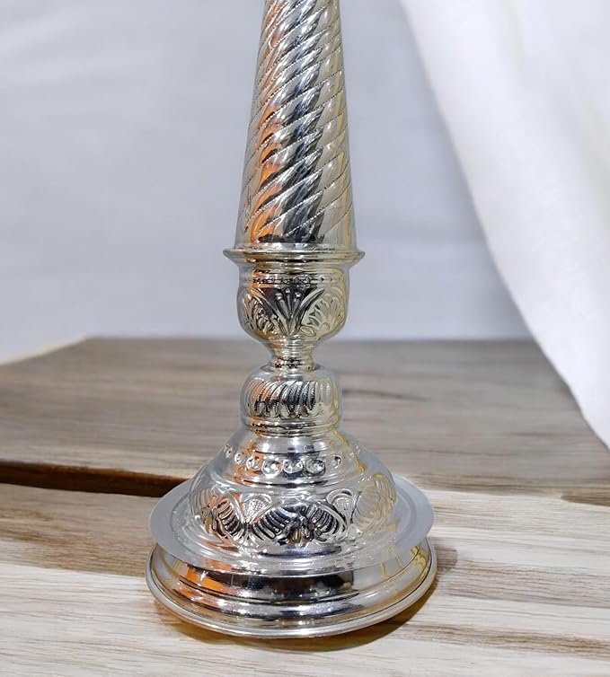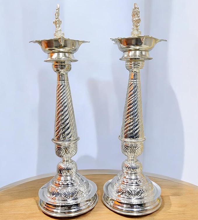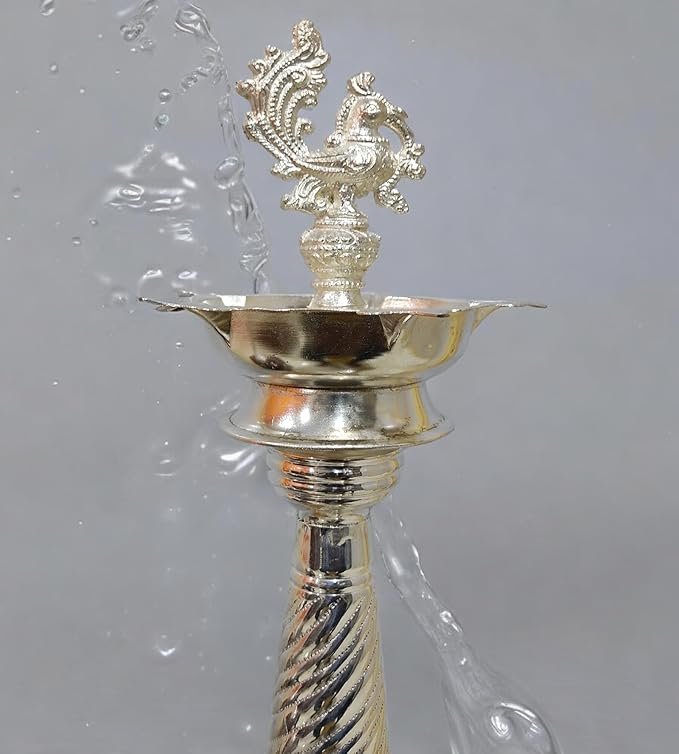 Elevate your home and temple décor with this exquisite German Silver Peacock Handle Diya. Crafted with precision, this elegant diya features a beautifully sculpted peacock handle, symbolizing grace and prosperity. Perfect for pooja ceremonies, meditation, or festive occasions, it adds a touch of traditional charm and sophistication to any sacred space. Made from durable German silver, it offers longevity while reflecting a subtle, elegant shine. Light up your home with positivity and create a serene ambiance with this decorative yet functional piece.