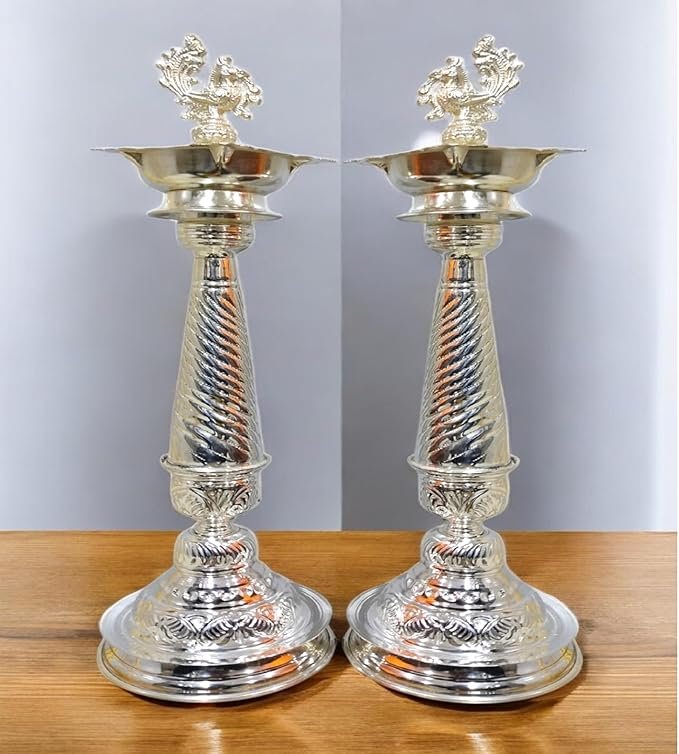 German Silver Peacock Handle Diya for Home & Temple Pooja Decore